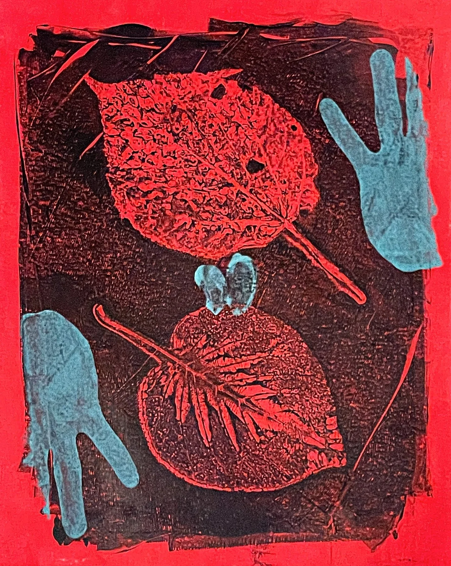 The images of hands are created by running the ink through handmade serigraphic stencils. The impressions of leaves are unique mono prints of plants collected in urban parks. Merging printing techniques produces unpredictable results reflective of the complex human-nature interactions.